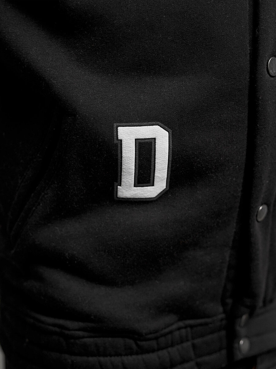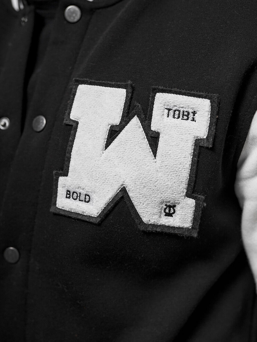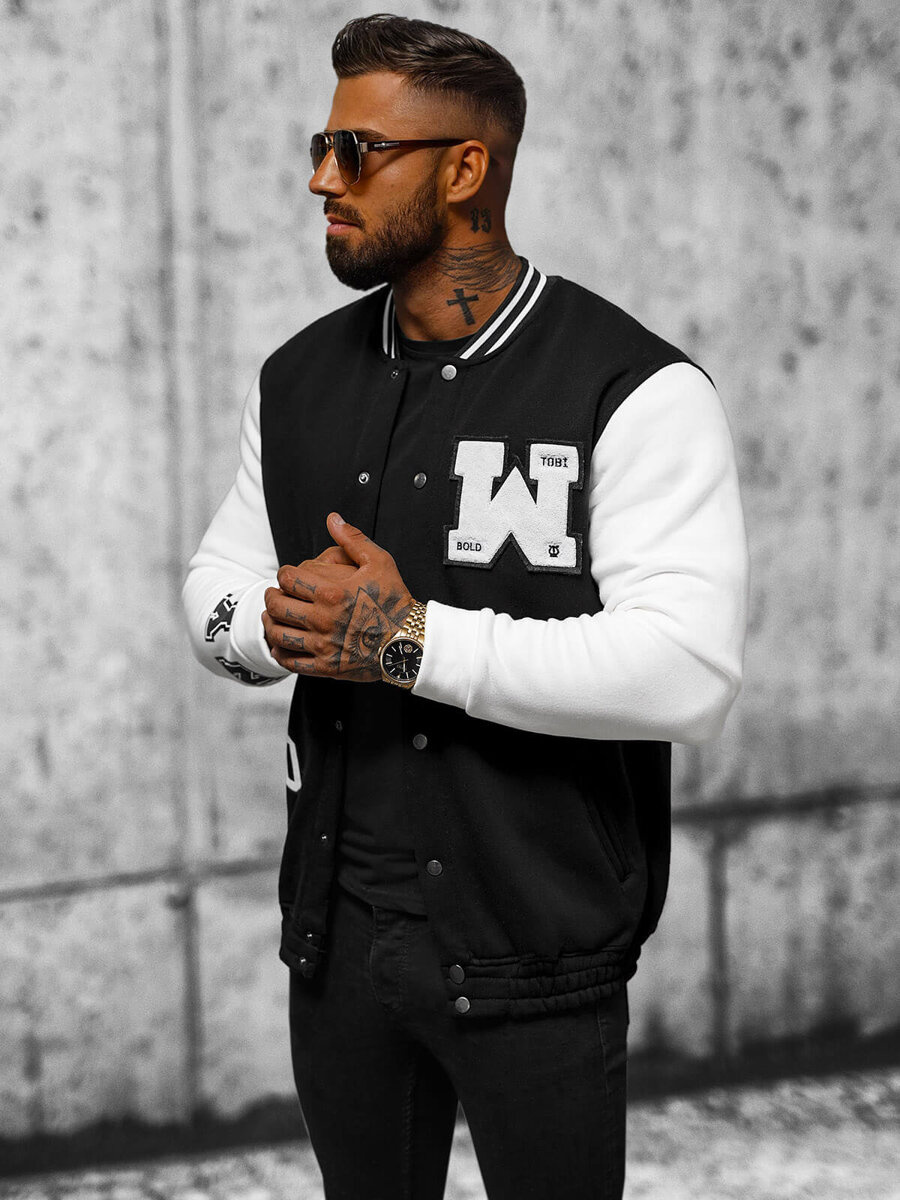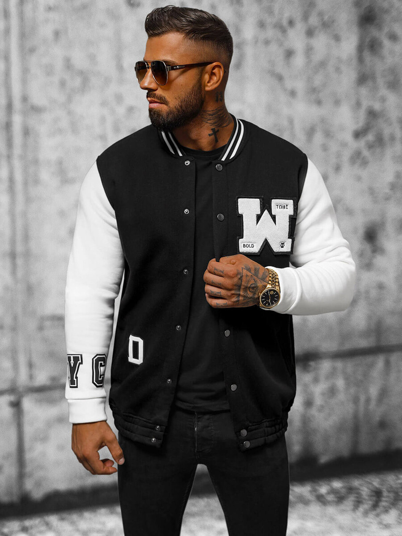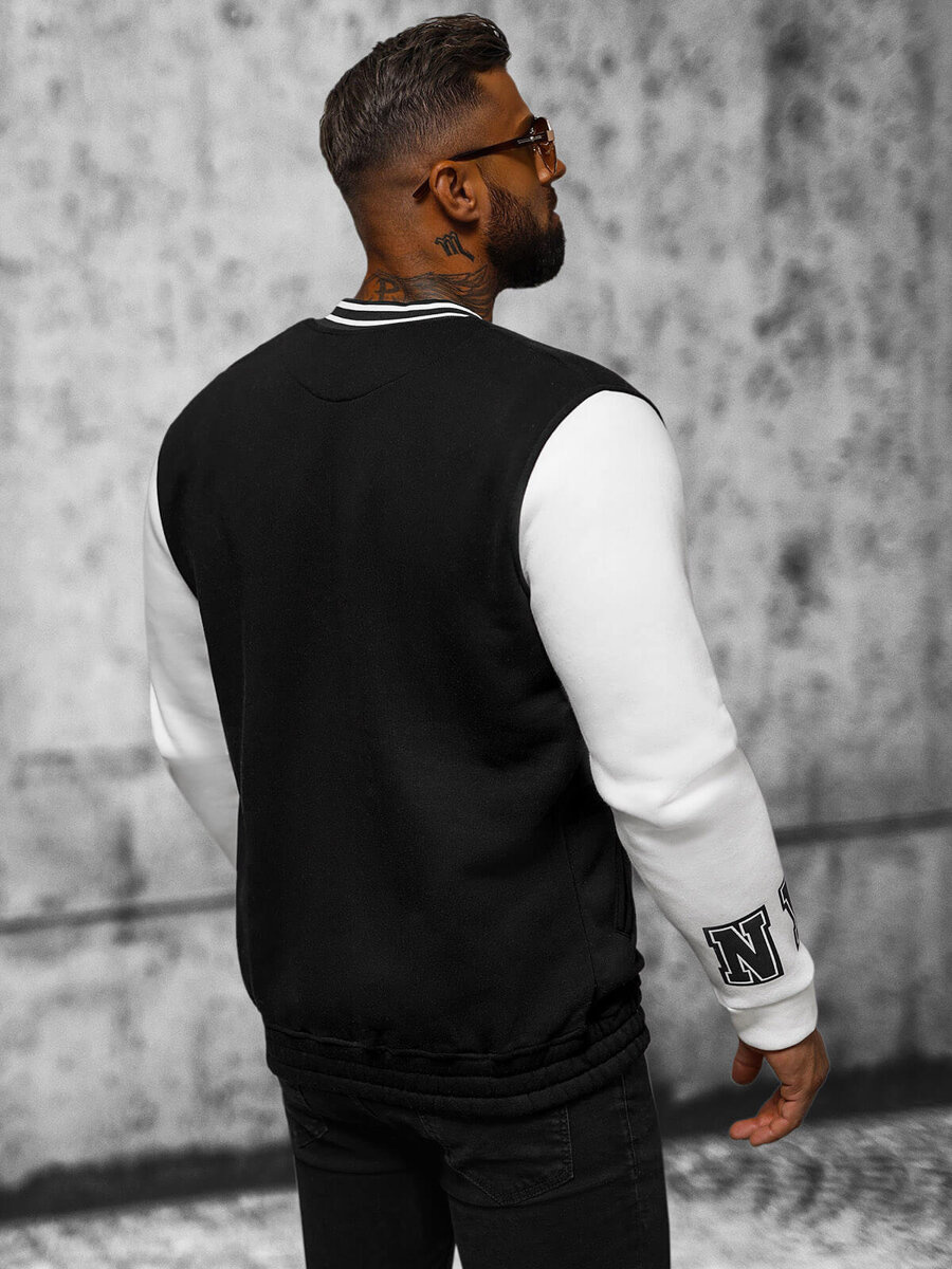 Μαύρο ανδρικό φούτερ μπέιζμπολ από την τελευταία συλλογή της OZONEE. Κλείνει με πιεστικά κουμπιά, έχει στρίφωμα στο στρίφωμα και στα μανίκια και πλαϊνές τσέπες. Κατασκευασμένο από υψηλής ποιότητας υλικόu, που αποτελείται από 99% βαμβάκι και 1% ελαστάν. Το μοντέλο με ύψος 182 cm και βάρος 87 kg παρουσιάζει μέγεθος XL.