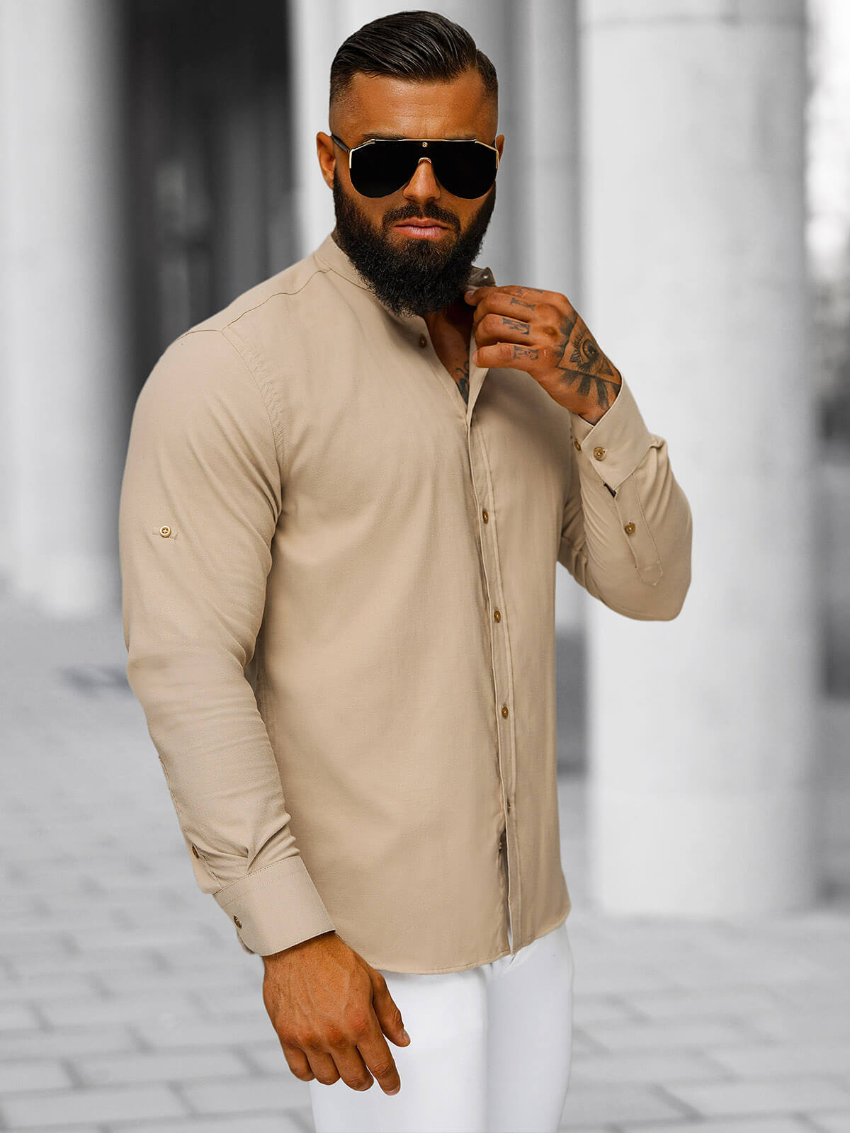 Το εξαιρετικά κομψό ανδρικό μπεζ πουκάμισο OZONEE O/V123 είναι ένα πραγματικό must-have στην γκαρνταρόμπα κάθε άνδρα. Αυτό το προϊόν από την τελευταία συλλογή συνδυάζει το κλασικό και το μοντέρνο, εξασφαλίζοντας μια μοναδική εμφάνιση για κάθε περίσταση. Το πουκάμισο είναι κουμπωμένο, γεγονός που προσθέτει στην κομψότητα και τη φινέτσα του. Τα μακριά μανίκια και ο όρθιος γιακάς του προσδίδουν χαρακτήρα και τονίζουν το ατομικό στυλ κάθε άνδρα.