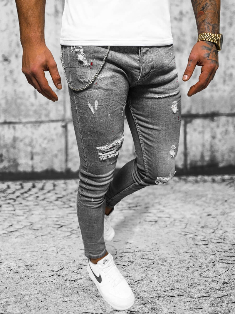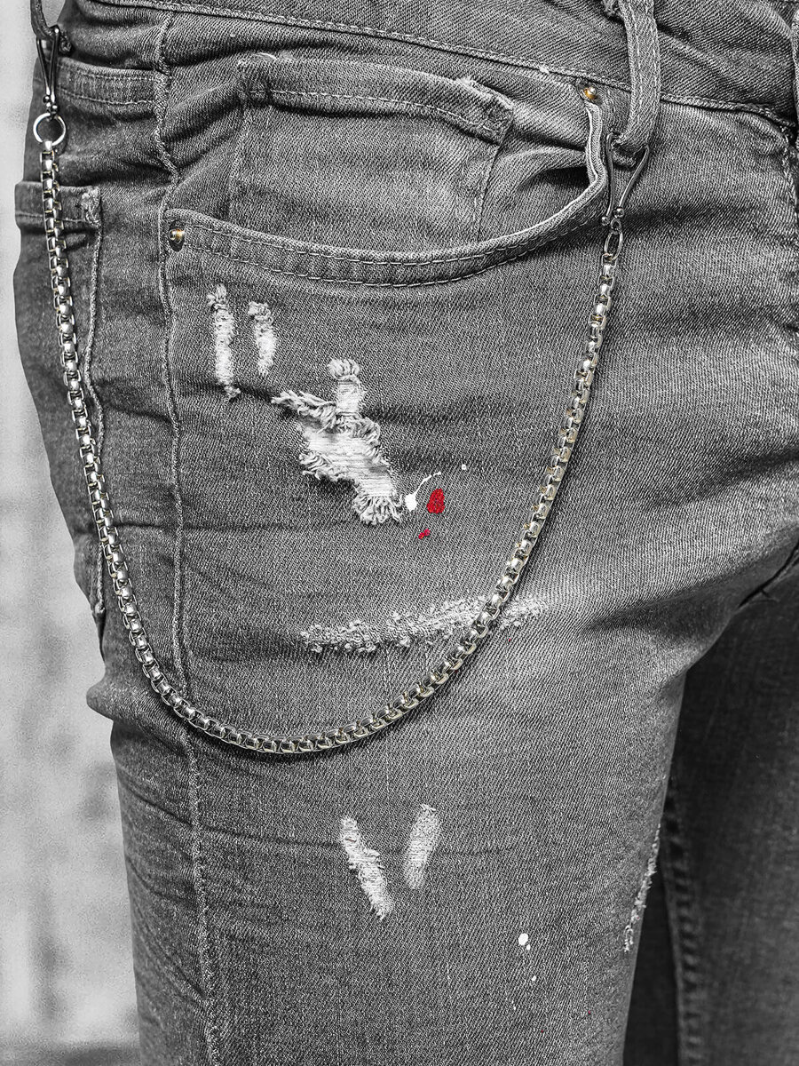 Αυτό το μοναδικό ανδρικό τζιν σε στενή γραμμή είναι ένας συνδυασμός στυλ και άνεσης. Εφαρμόζουν άνετα, τονίζοντας τη σιλουέτα, ενώ παράλληλα επιτρέπουν την ελευθερία κινήσεων. Το μοντέρνο τρίψιμο προσθέτει χαρακτήρα, ενώ η διακοσμητική αποσπώμενη αλυσίδα είναι μια εντυπωσιακή λεπτομέρεια που τονίζει το ατομικό στυλ. Οι τσέπες μπροστά και πίσω δεν είναι μόνο πρακτικές, αλλά παρέχουν και ένα ενδιαφέρον διακοσμητικό στοιχείο.