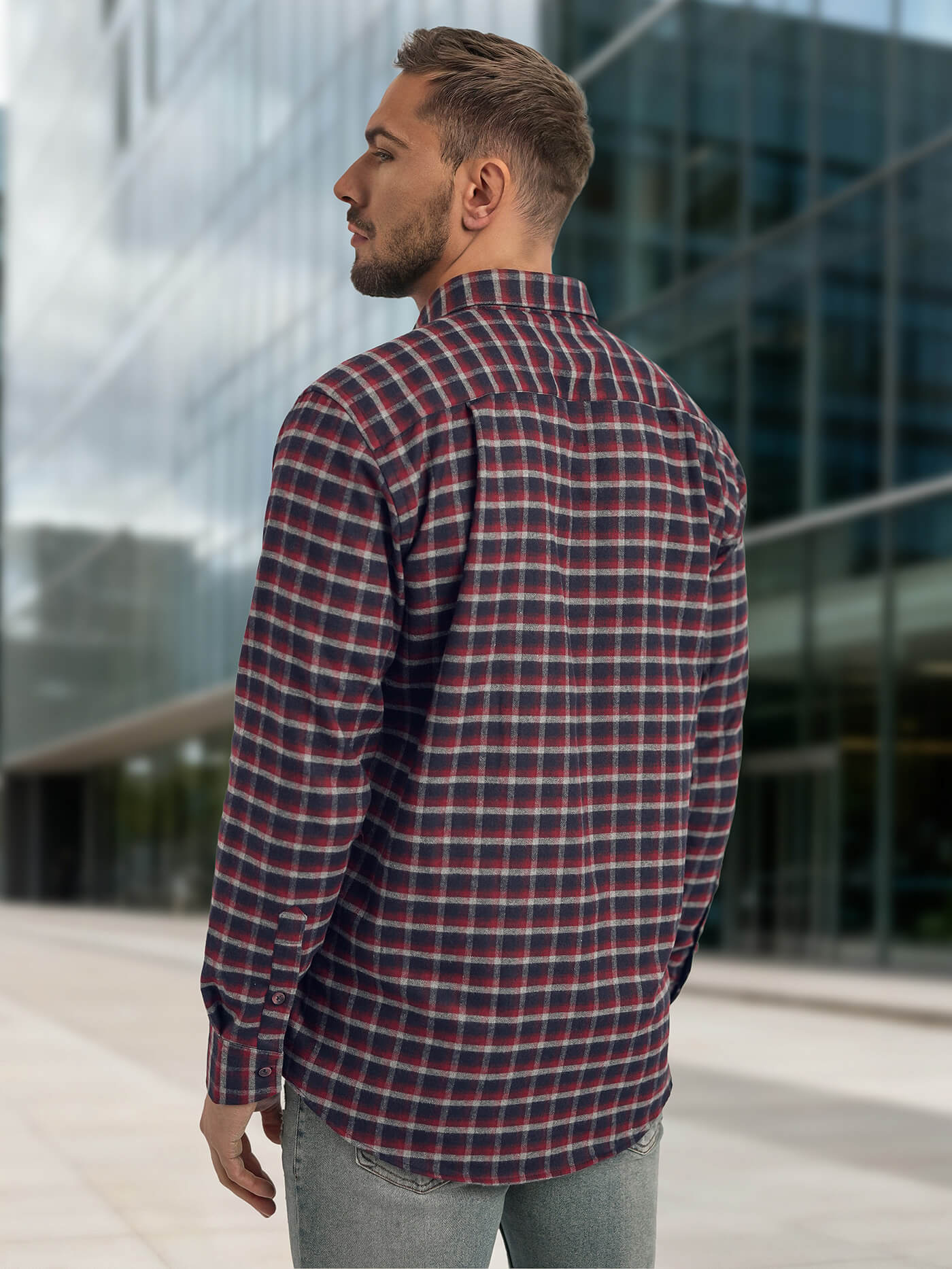 - Μοντέρνο καρό σχέδιο; Γιακάς button-down; Ύφασμα: 50% βαμβάκι, 50% πολυεστέρας; Μοντέλο (183 cm, 80 kg) φοράει μέγεθος L.